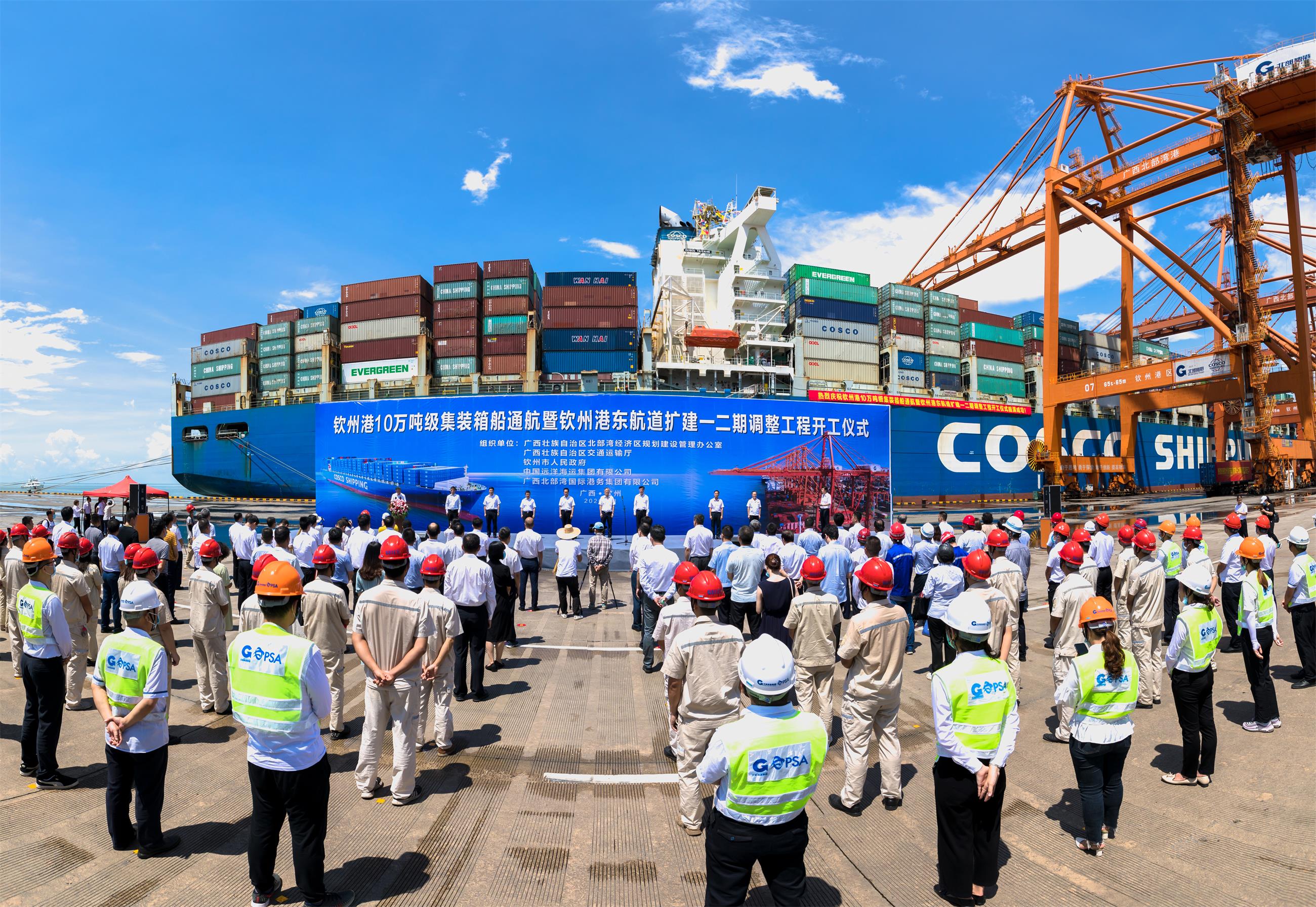 當天,欽州港首次通航1萬標箱集裝箱船舶暨欽州港東航道擴建一二期調整工程開工儀式在欽州港大欖坪南作業區成功舉辦。為了滿足20萬噸級船舶通行要求、積極打造國際門戶港建設,北部灣港集團把航道的拓寬、浚深作為重點工程來抓。目前通航的欽州港東航道擴建項目全長25.79公里,航道深度-13.3米,航道寬度拓至390米,達到10萬噸級、1萬TEU集裝箱船舶通行標準。欽州港東航道一二期調整工程於7月30日開工建設,明年6月建成投入使用,航道深度達-16.3米,將滿足20萬噸級、2萬TEU集裝箱船乘潮通航要求。