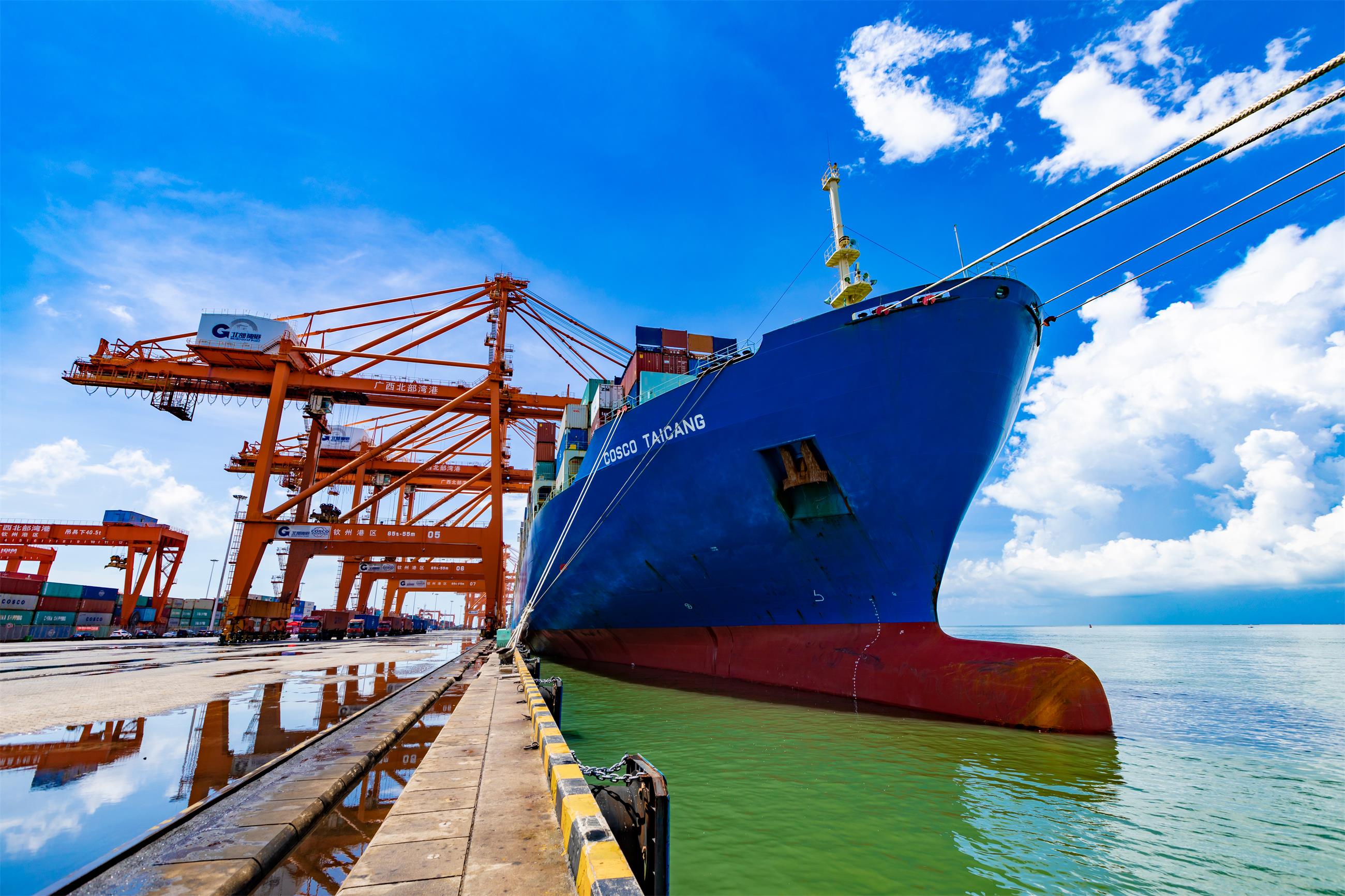 10萬噸級「中遠太倉號」集裝箱船正在靠泊北部灣港欽州港區