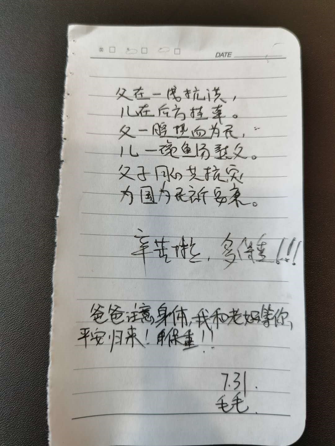 【香港商報網訊】「父在一線抗洪,兒在後方掛牽。父一腔熱血為民,兒一碗魚湯慰父。父子同心共抗災,為國為民祈安康。」建軍節前夕,在淮河姜唐湖行蓄洪區戴家湖防汛一線值守的阜陽軍分區副司令員龔輝收到一封家書。兒子毛毛在信里說,「爸爸注意身體,我和老媽等你平安歸來!保重!」紙短情長,讓人淚目!