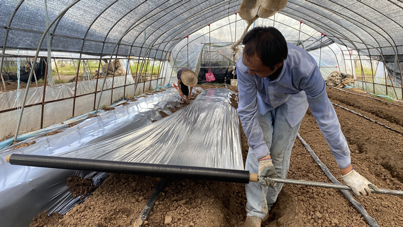 8月4日,在安徽黃山市屯溪區奕棋鎮江村志宏蔬菜基地的大棚內,工人們正在給受災後平整過的土地蓋膜,為移栽的蔬菜苗施肥。