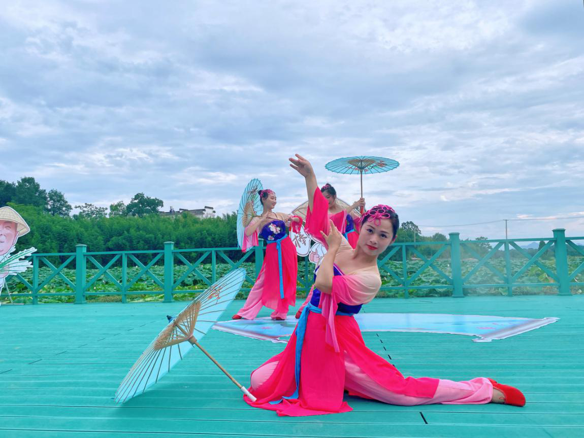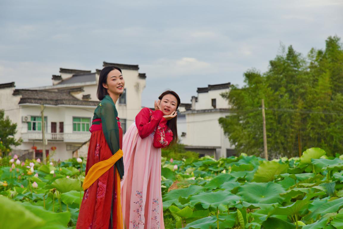 活動現場,身著漢服的女子慢步蓮藕基地,田野間優雅的古箏聲陣陣傳出,花開正旺的荷花與碧綠的荷葉隨風舞動,詩意的田園風光,吸引不少遊客前來拍照打卡。