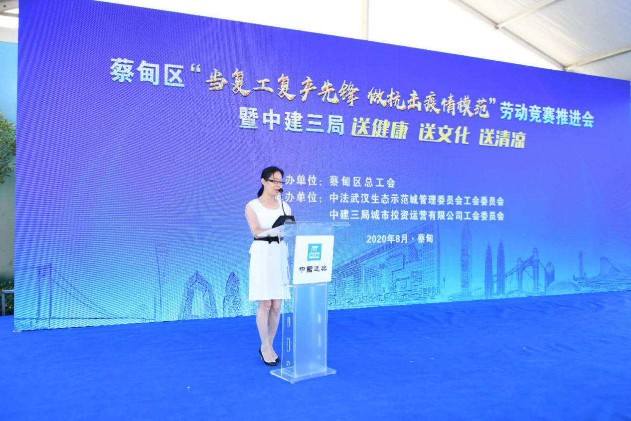 活動中,中建三局城市投資運營公司黨委副書記、工會主席趙德福現場致辭,中建三局蔡甸施工項目單位現場作勞動競賽挑(應)戰書,黃江波及武漢市總工會黨組成員、副主席劉斌現場為中法生態城投資在建項目施工代表單位授發勞動競賽旗幟,並為奮戰在建設一線的工友代表「送健康、送文化、送清涼」。除此之外,相關建設單位和醫療單位負責人還現場簽訂了醫療救助綠色通道協議,為建設蔡甸施工項目的工友突發安全事故救助提供綠色通道,並為建設蔡甸的工友代表贈送《習近平談治國理政第三卷》、《中華人民共和國民法典》、《新時代公民道德建設實施綱要》、《新時代愛國主義教育實施綱要》和有關農民工勞動保障知識的書籍,同時為農民工們發放「送清涼」物品禮包。(李明 許美鳳 張迪)