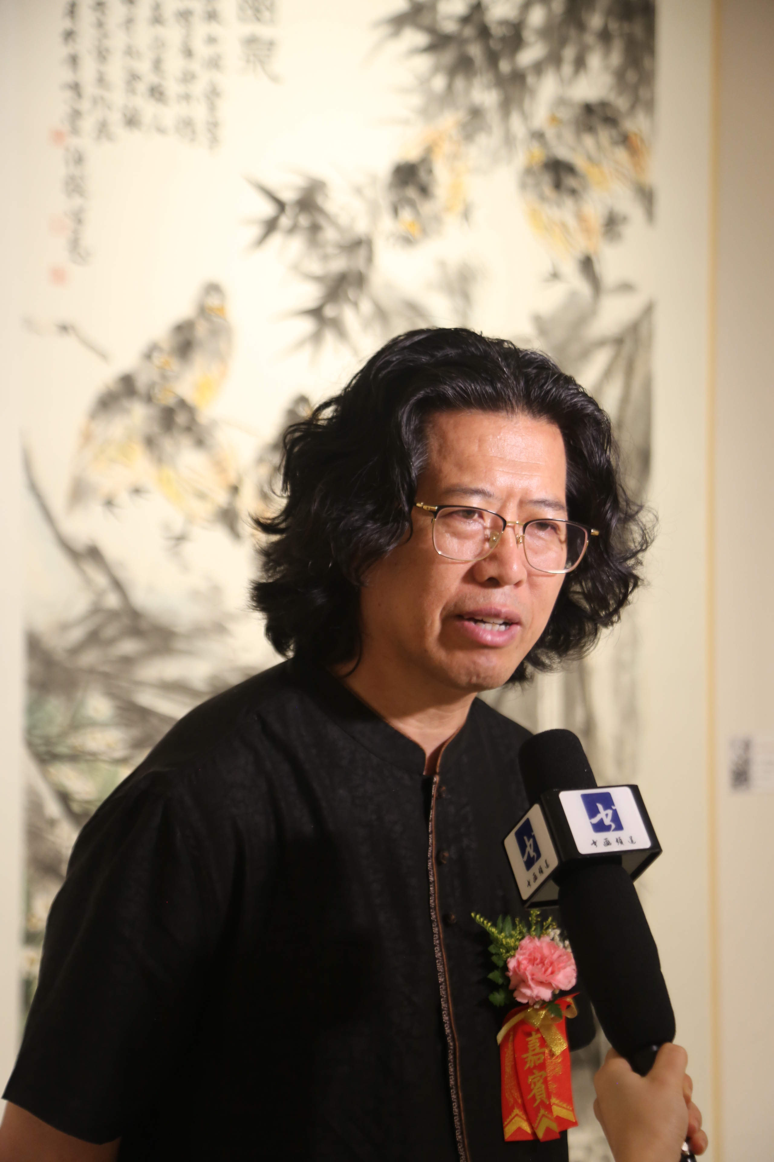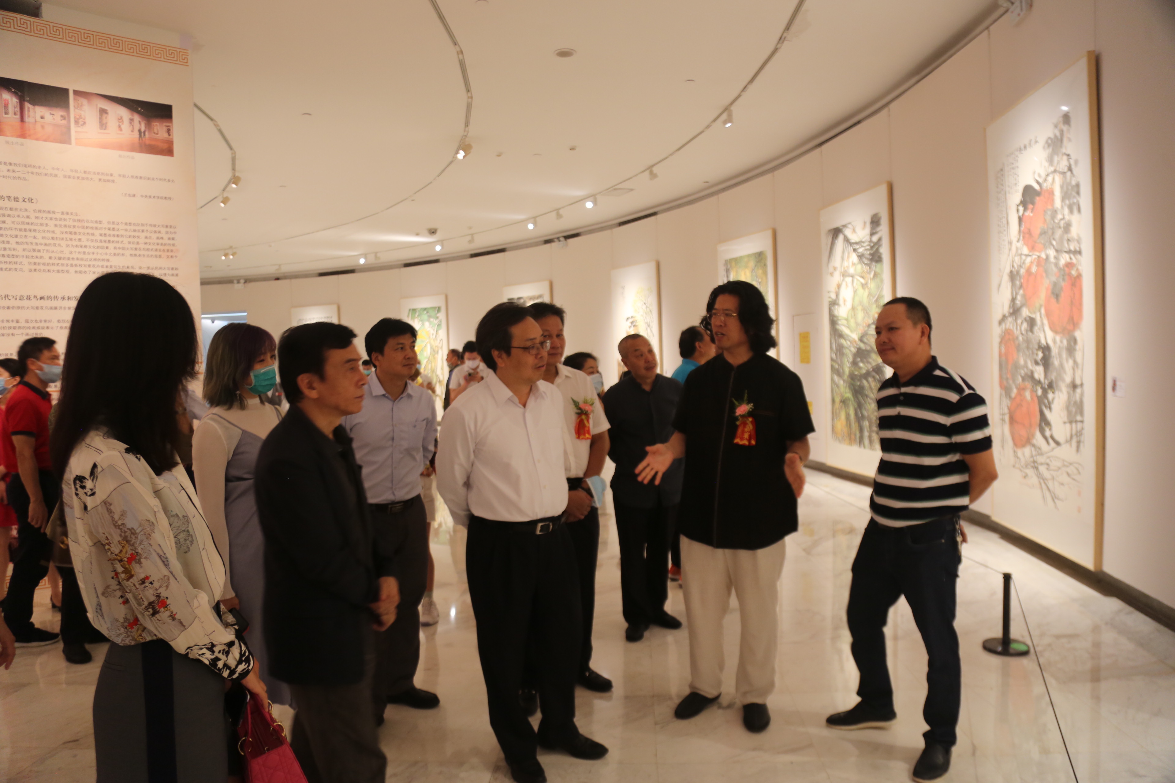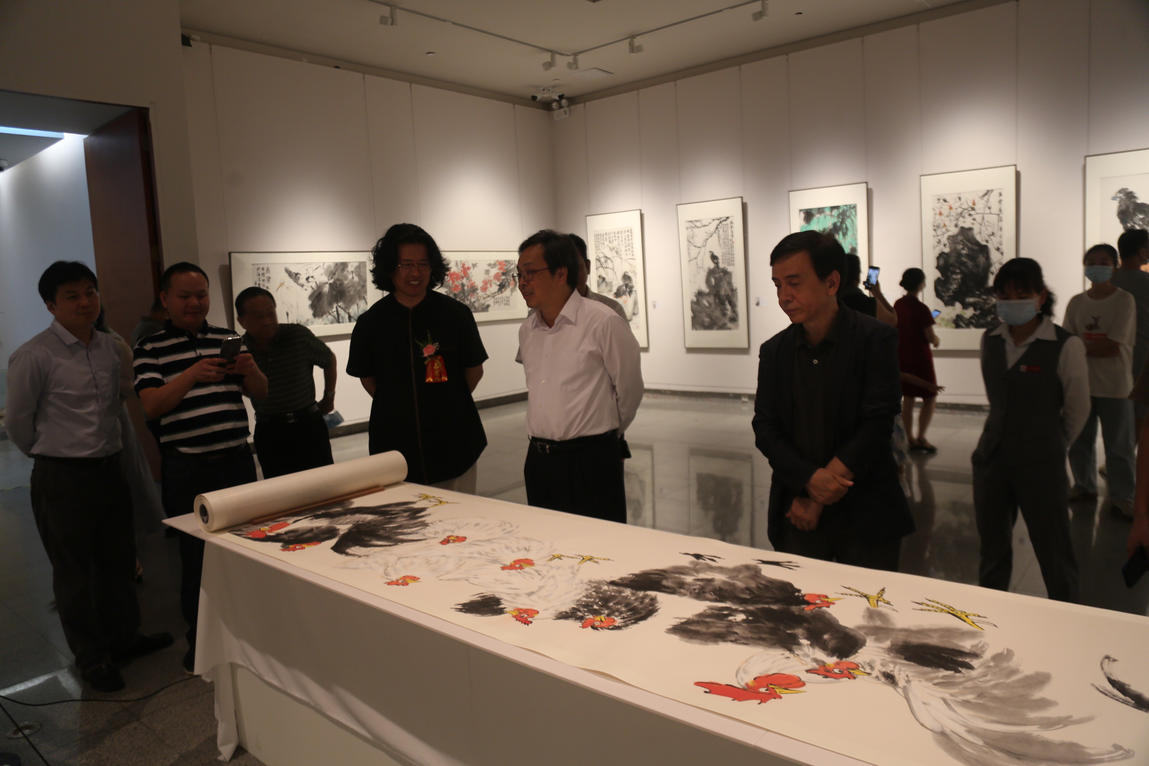 主持人由深圳市美術家協會主席、關山月美術館館長陳湘波擔任,深圳市委原宣傳部部長李小甘宣佈畫展開幕! 著名評論家、學者、原《美術》雜誌主編王仲先生及廣東省美協副主席梁宇先生發言中說:中國大寫意花鳥畫是中華文化重要的文脈傳承之一,是我們民族傳統國畫藝術中的重要組成部分。當代大寫意花鳥畫著名畫家伯揆先生以傳承寫意文脈為己任,將禽鳥,花卉融入大自然,賦予大格局,大氣魄,塑造出積極、厚重,大美的藝術生命氣象,反應了新時代的民族氣象和美學典範,伯揆先生有深厚的文化傳統及詩人般的情懷。作品不僅氣勢磅礴,大開大合,而且趣味盎然,生機勃勃。給人以正大氣象及極強的生命力!在大寫意花鳥畫領域取得了非凡成就。 在民族文化復興的當下大背景下,伯揆先生的藝術成果和獨特的藝術風貌乃至中國大寫意精神,正激勵和鼓舞著一大批藝術家和社會各界人士,在國內外美術界產生了廣泛的影響。參加本次展覽的深圳各界人士,都對伯揆中國寫意花鳥畫,給予極高大的評價!也為深圳社會各界提供了一次學習、探尋中國傳統優秀文化和中國寫意精神的契機,同時今年也是深圳市建市四十周年,為深圳市提供了一次弘揚中華優秀文化,推廣新時代的民族氣象,積極、大美的美學典範,伯揆先生為深圳市文化名城的打造助一臂之力,記者在現場看到有一卷36米長的畫卷,裏面畫滿了一百只栩栩如生、活靈活現的不同品種的雞,讓觀眾會心一笑的同時也打開眼界。