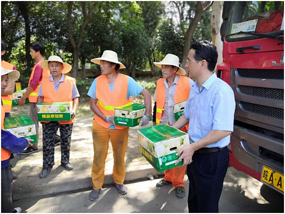 「大夥趕快來領取防暑降溫大禮包,先到先得啊……」在客家人環境管理公司冬梅路段的保潔現場,堅守一線的王阿姨難掩內心的喜悅,對她的工友們大聲吆喝道。王阿姨對此次「送清涼」活動表示非常開心、感動,同時她也希望大家都能夠愛護環境衛生,愛護公共設施。