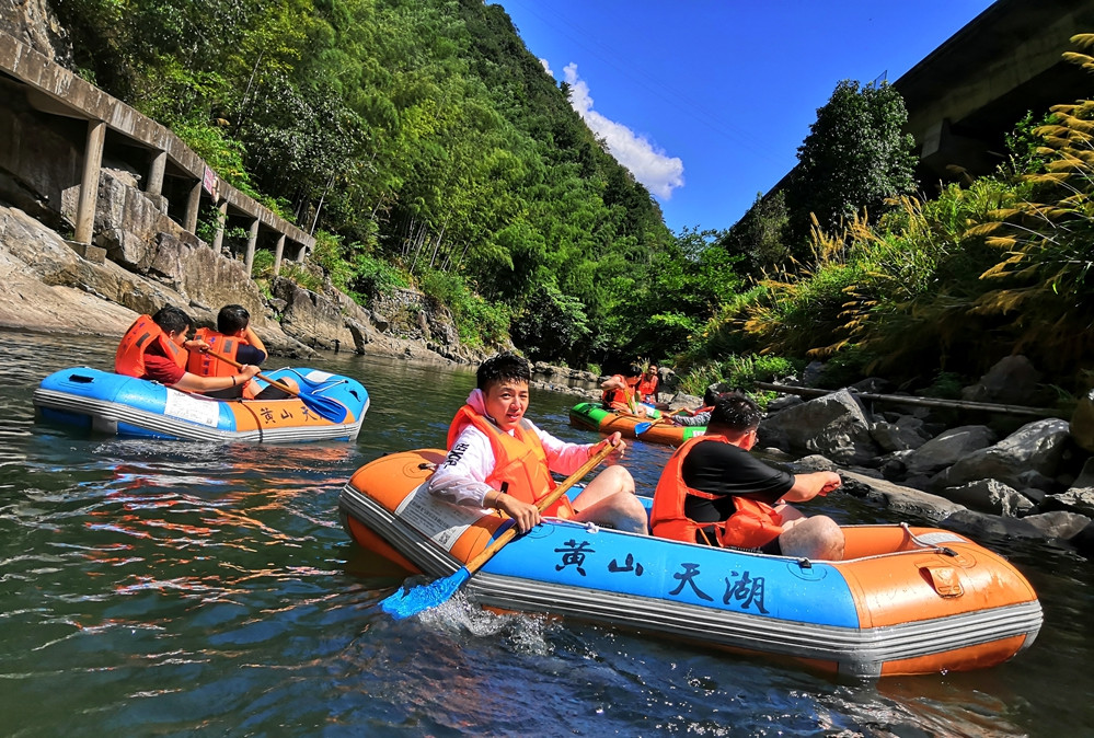 如此愜意清爽,確實是假期難得的清涼體驗。據瞭解,景區劃分有峽谷觀光、水上娛樂、古洞驚魂、竹海風情、山越民俗文化、玻璃天橋六大主題區,使天湖景區真正成為一個集觀光、體驗、休閒於一體的綜合性景區,其也被形象地稱為“隱於黃山的歡樂谷”。