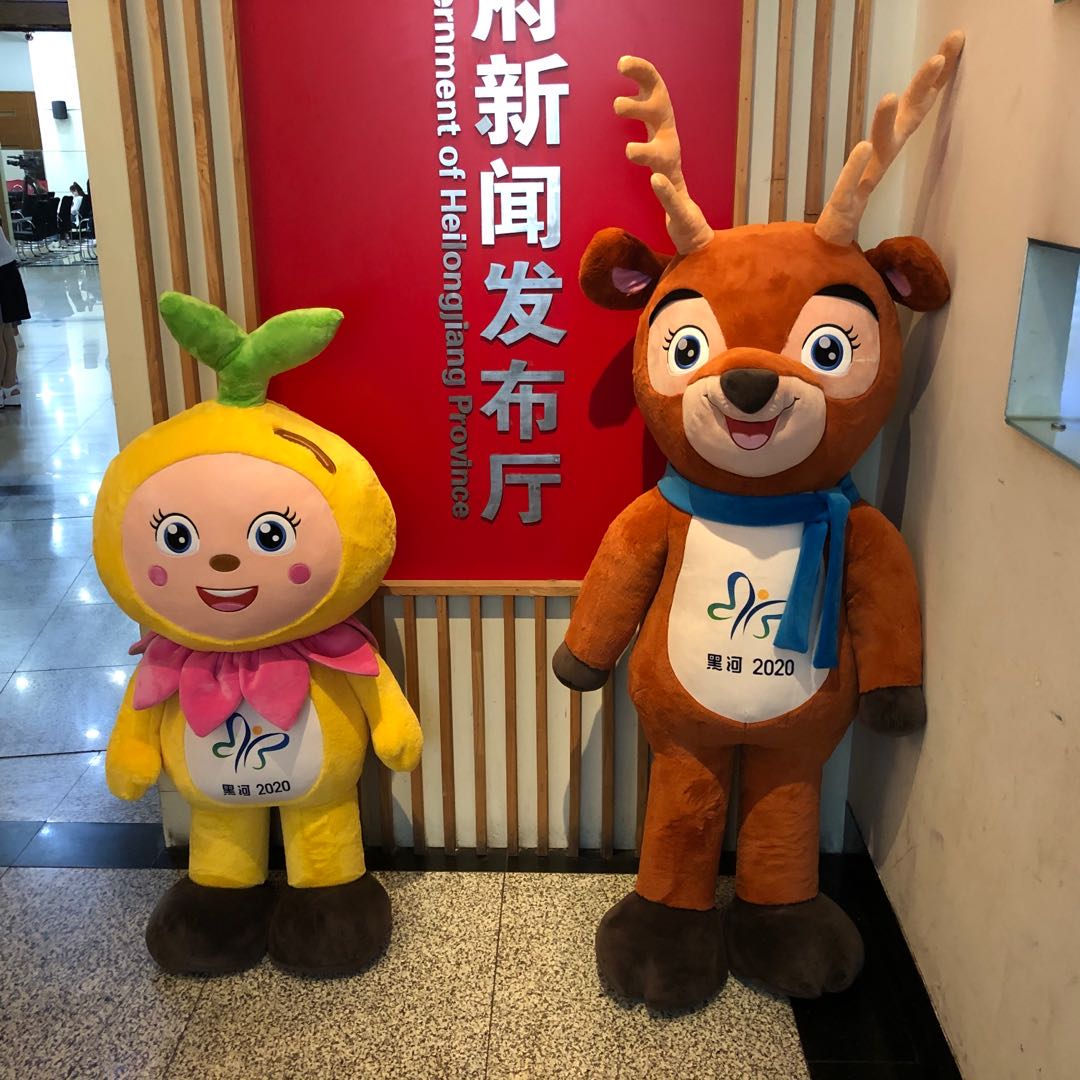 狄恆表示,本次大會設計了兩個吉祥物,一個是鹿寶寶「呦呦」,一個是豆寶寶「逗逗」。鹿寶寶「呦呦」語出《詩經?小雅》:「呦呦鹿鳴,食野之苹。我有嘉賓,鼓瑟吹笙。」一群鹿兒呦呦叫,在那原野吃蒿草。我有美酒香而醇,宴請嘉賓任逍遙。麋鹿來自廣袤的森林,象徵着人與自然的和諧共存;鹿角象徵黑河連綿的山脈和交錯的河流;藍色圍巾化身為黑龍江,將中俄雙子城-中國黑河與俄羅斯布拉戈維申斯克緊緊相連。