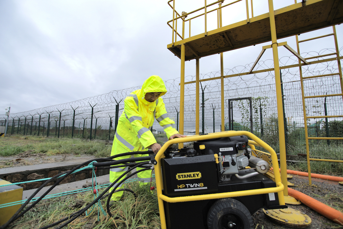 此外,在降雨期間,青島機場各級領導現場指揮,應急處置人員和物資設備迅速到位,增強現場備勤力量。迅速開啟飛行區內排水閘門排水,加強重點部位、地勢低洼區域的排水,確保機場區域排水暢通性。防汛的同時,全力做好惡劣天氣下的航班保障工作,提前在機坪積水區域架設木橋,方便旅客通行;提前準備一次性雨衣並免費提供給旅客;在機場周邊區域派出交通志願者協助交警實施交通調流。