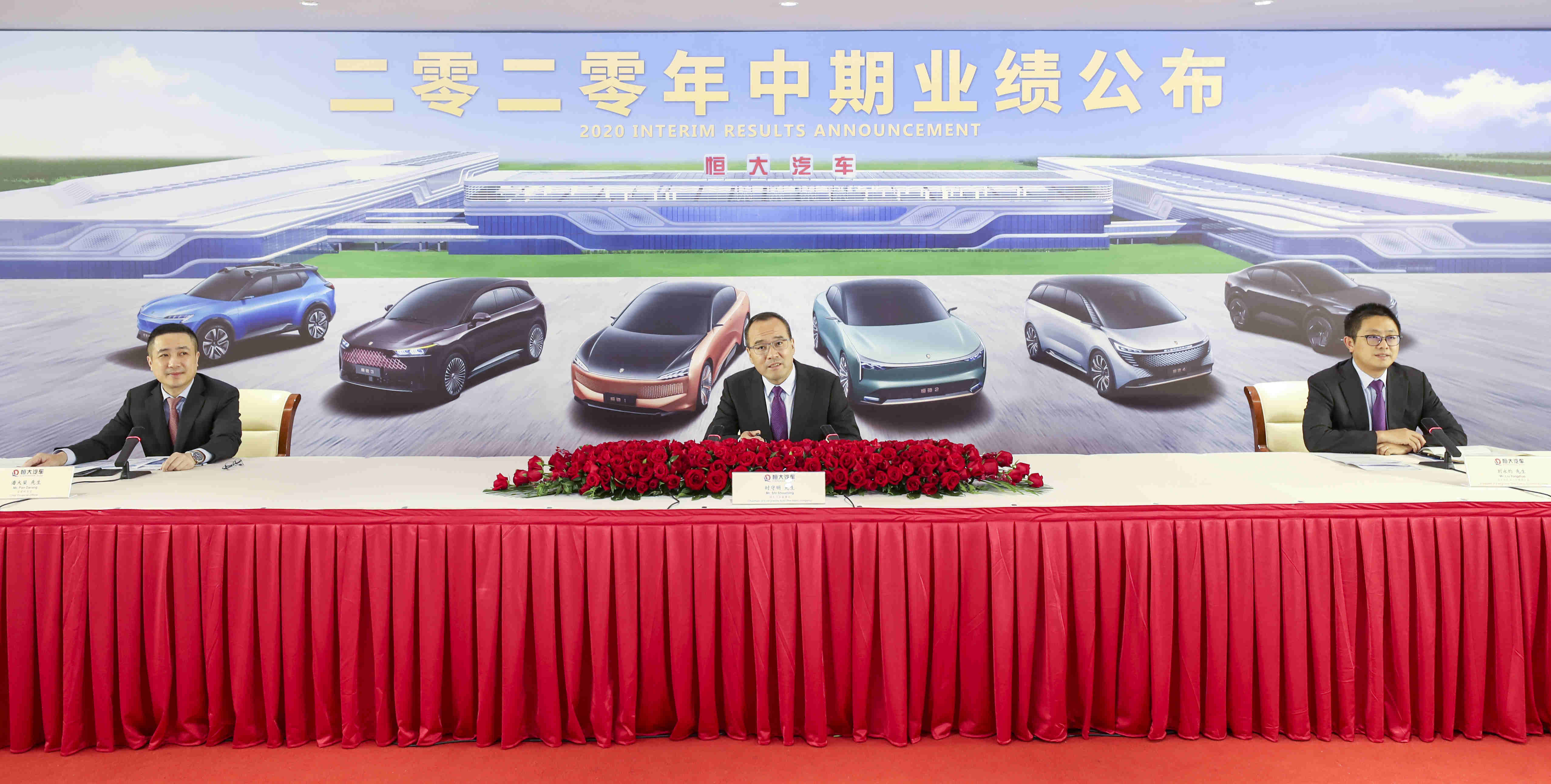 執行董事及董事長時守明先生(中)、執行董事及副董長劉永灼先生(右)及首席財務官潘大榮先生(左)出席中國恆大新能源汽車集團2020年中期業績網上發佈會