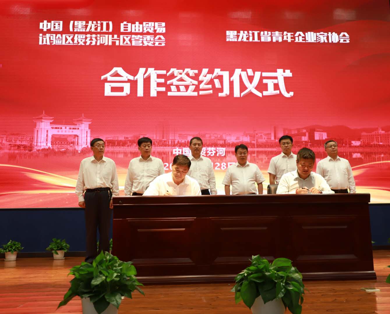 綏芬河市長王永平主持推介會,玉泉酒業楊立友、龍格工程設計徐進、佰富冷凍食品徐曉蕾、美苑文化藝術學校紀寧、小康龍江遲妍妍、北貨郎森林食品杜帛霖等企業家作精彩發言。綏芬河市副市長片區管委會副主任王曉宇作重點投資項目推介。省青企協與綏芬河自貿片區管委會簽署了合作框架協議,省青年電商協會與綏芬河自貿片區管委會簽署了跨境電子商務合作框架協議,哈爾濱醫科大學附屬第四醫院與綏芬河市人民醫院簽署了醫聯體合作共建協議。