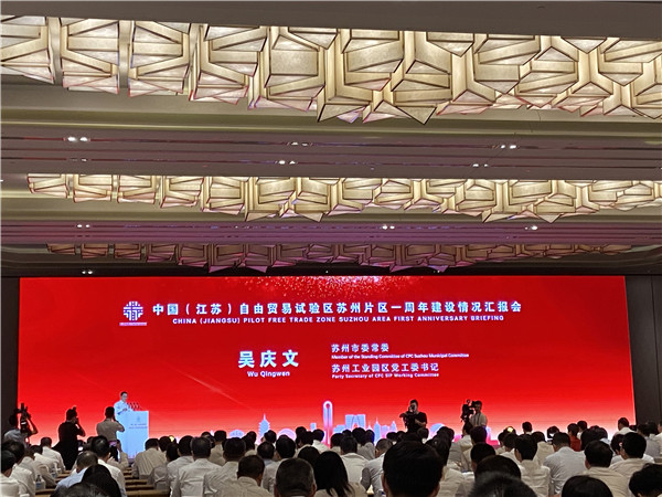 蘇州市委常委、園區黨工委書記吳慶文現場匯報蘇州自貿區建設一周年成果