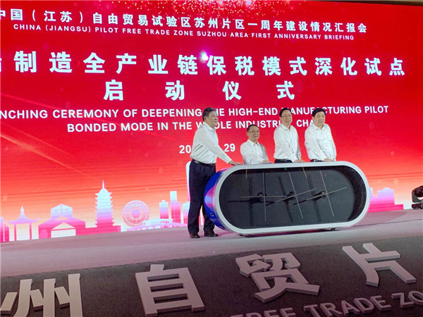 江蘇省委常委、蘇州市委書記藍紹敏、國研智庫首席經濟學家趙建軍、江蘇省稅務局局長侍鵬、南京海關關長吳海平共同啟動高端製造全產業鏈保稅模式改革深化試點