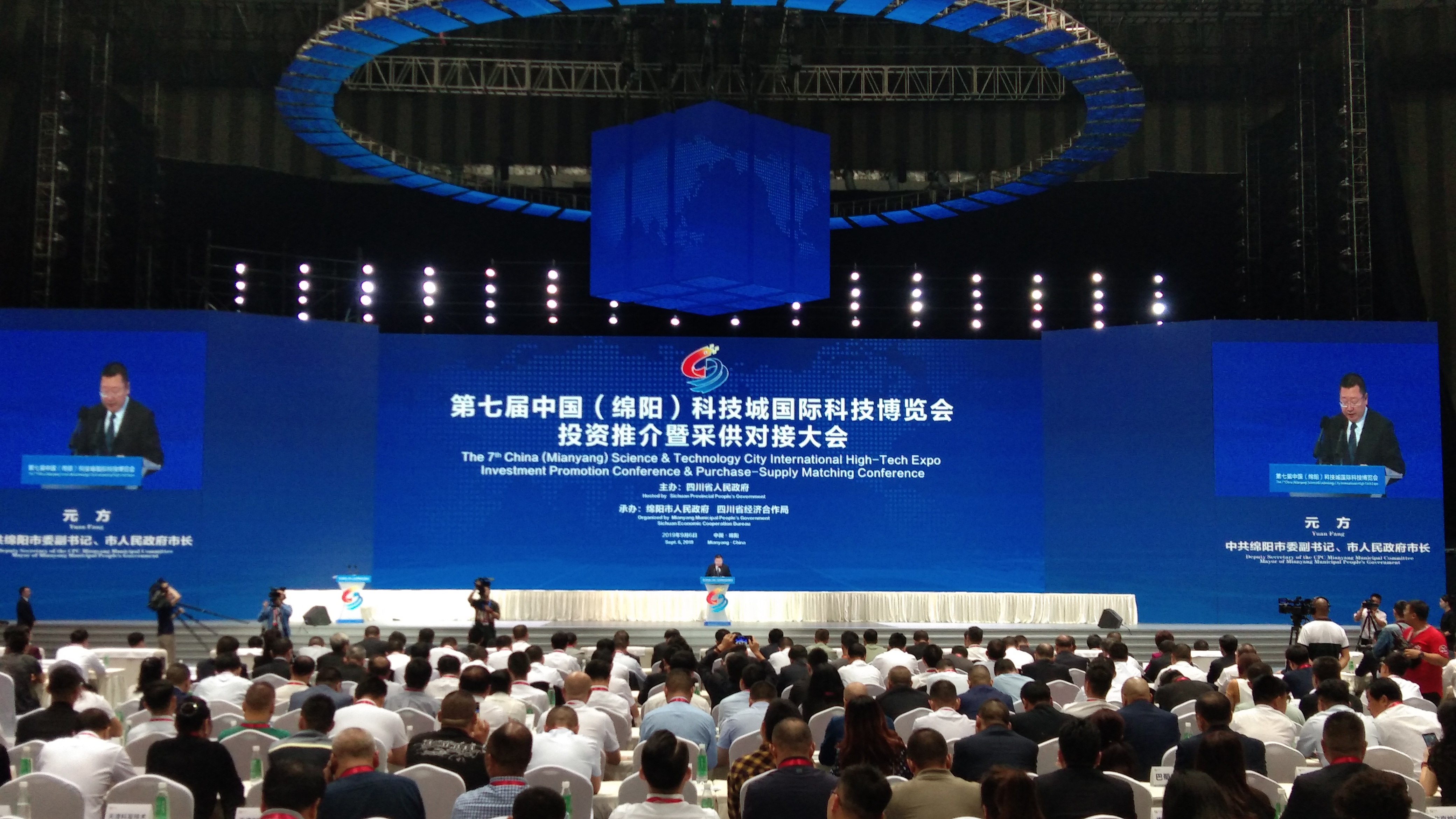 2019年,第七屆科博會有94戶企業參展,俄羅斯、捷克、以色列等「一帶一路」沿線國家,ABB、松下、微軟、3M、江森自控等20家世界500強企業、119家境外企業參展參會。在展陳綿陽市六大重點產業的基礎上,突出展示了新型顯示、智慧家庭、新型功能材料、5G、北斗衛星應用、新能源和智能網聯汽車等創新產業領域的最新成果,充分展現了近年來綿陽產業招商的重大成果、先進制造業的發展現狀和西部先進制造強市的光輝前景。截至當年9月7日,觀展人數已達到11.9萬人次,其中專業觀眾達2.2萬人次。同時,在當屆投資推介暨采供對接大會上,全國政協副主席邵鴻,四川省委書記彭清華,科技部副部長王曦以及15個國家部委共27位領導、16個單位的47位軍方代表(6位高級將領)、153名專家學者(5位院士代表)和169名外籍嘉賓、世界500強、119家境外企業、中國500強、中國民營500強、行業100強、央企、國企、商(協)會、科研院所、大專院校、投資機構、金融機構和高新技術企業負責人,共600餘名客商嘉賓出席,43個省級部門及20個市州蒞臨盛會,參會嘉賓達1300餘人、賓客9000餘人。現場共簽約項目105個,投資金額923.75億元。其中,綿陽市簽約項目53個,投資金額678.10億元。