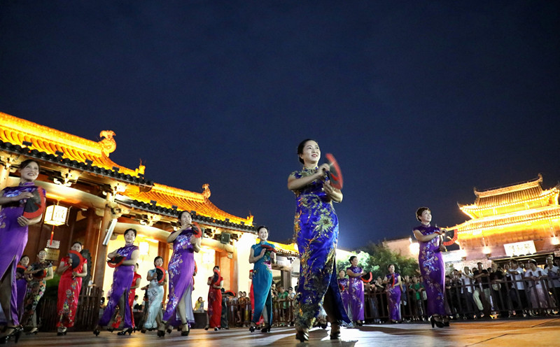 8月29日晚,國家歷史名城、中國四大古城之一的安徽黃山市歙縣徽州古城非遺夜市如期進行,60多名城鄉婦女身穿旗袍表演《盛世國風》、《中國美》,給古城夜市增添美景。