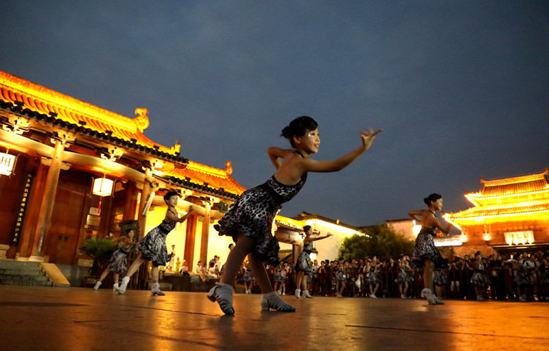 當晚,歙縣旗袍文化協會、藝蓮舞蹈藝術中心和“老來樂”舞蹈隊在徽城鎮府衙廣場表演了手鼓《好兒好女好家園》、拉丁舞《快樂寶貝》、倫巴舞《心雨》等與非遺相關的節目,翩翩舞姿為夜色增色添美。