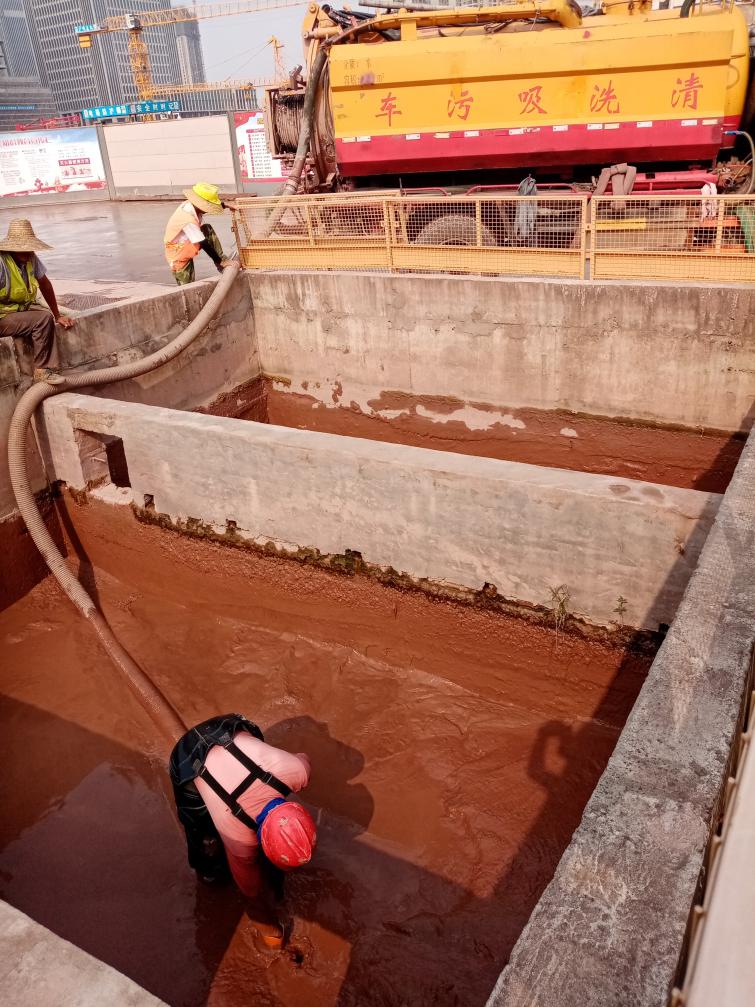 工人正在用清洗吸污車吸走黃泥