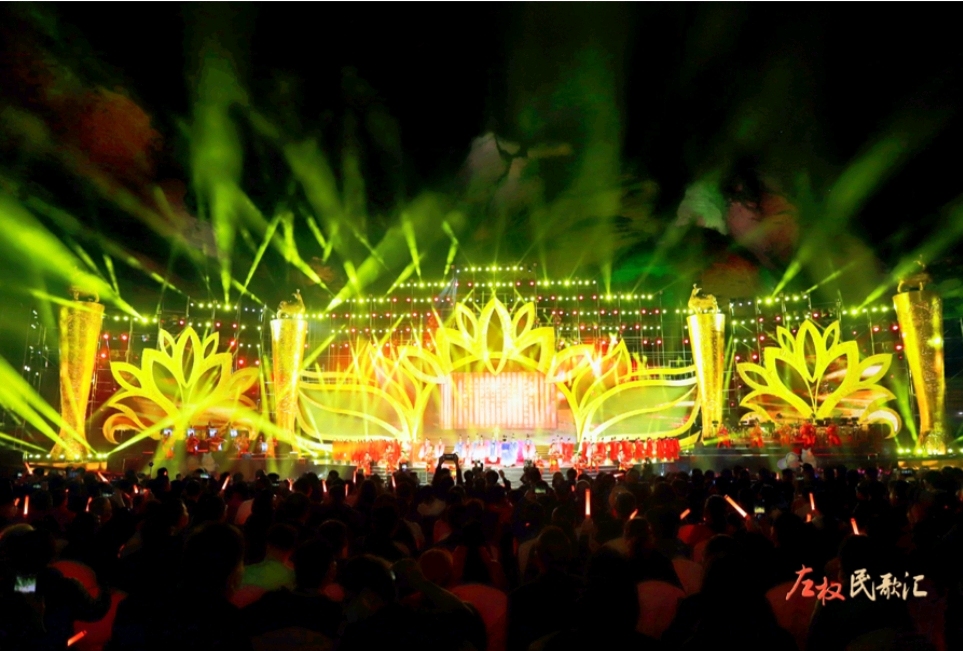 2020年左權民歌匯總決賽暨頒獎晚會在太行之巔,左權蓮花岩景區內舉行。晚會的主舞臺由巨型金尊獎盃和璀璨金蓮兩部分組成,展示出“花開左權·大美太行”的氣勢磅礴。巨大金尊獎盃的設計取自山西博物院鎮館之寶晉侯鳥尊,鳳鳥的形象寓意讓民歌插翅騰飛,生生不息。