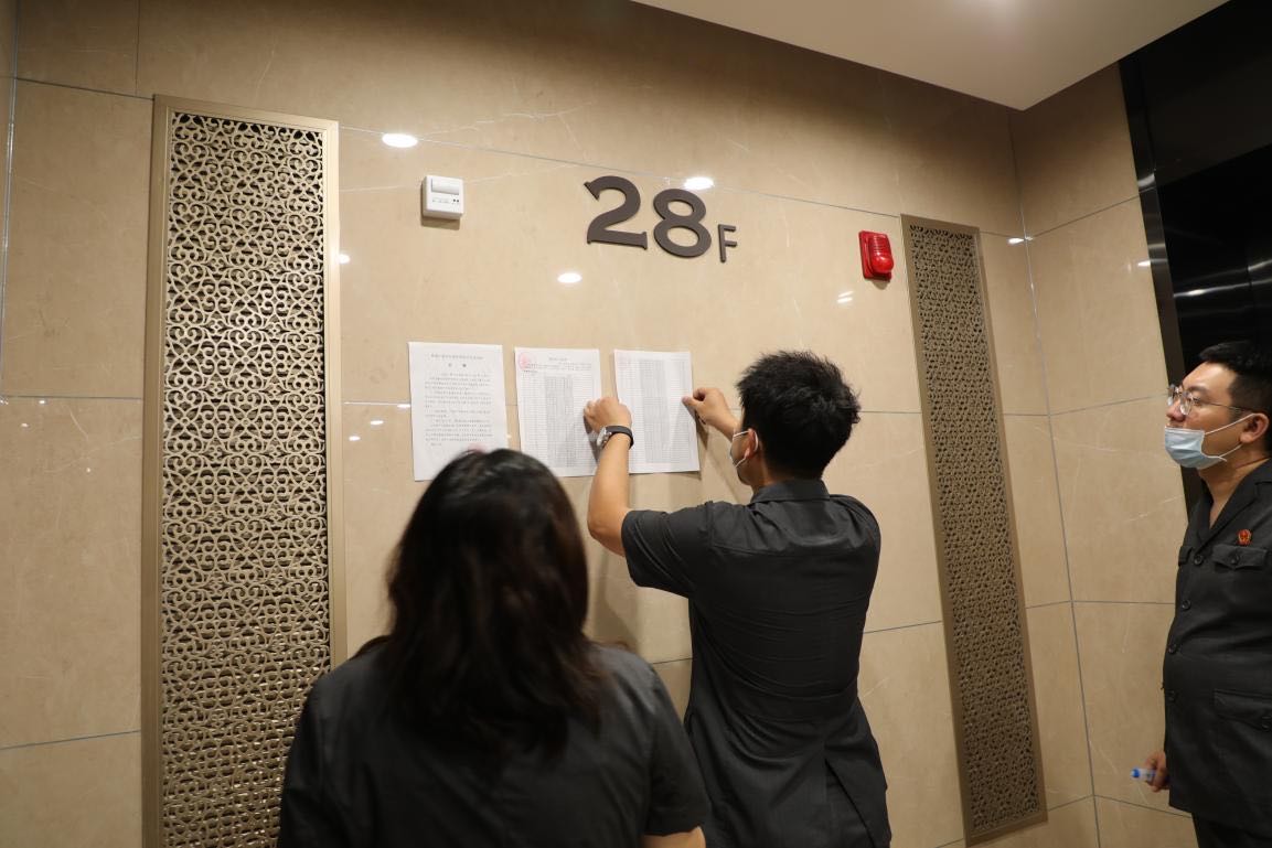 9月5日(星期六),院執行局副局長王濤帶領20餘名執行幹警奔赴位於香坊區紅旗大街的一處寫字樓,分四個工作組對分處在21個樓層的134間房產進行預查封(另18間房產因在使用中,故申請人申請僅對其房產檔案進行預查封),依次張貼裁定書、封條,並在相應樓層張貼了預查封財產清單和公告。歷時兩個小時,保全查封工作全部完成。