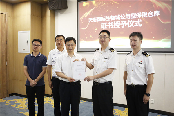 【香港商報網訊】記者 郭代勤 報導:9月8日,保稅庫註冊登記證頒發儀式在成都天府國際生物城舉行,成都天府國際生物城供應鏈公司獲得由成都海關頒發的保稅庫註冊登記證。這也是四川省在生物醫藥領域發出的首張保稅庫註冊登記證。