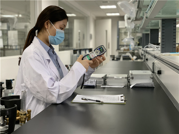 廣州計量院計量工程師利用標準氣體對受檢儀器進行標定,並現場讀取檢測數據。(通訊員供圖)