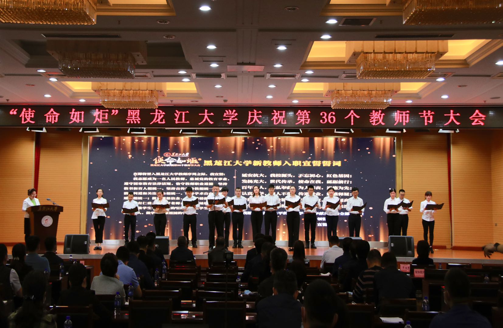 大會首先舉行了新教師入職宣誓儀式。42名有志於教書育人的年輕教師朝氣蓬勃、豪情滿懷,在青年龍江學者、電子工程學院趙曉鋒教授的帶領下莊嚴宣誓,願為培養高水平的黑大學子奉獻自己的全部力量。
