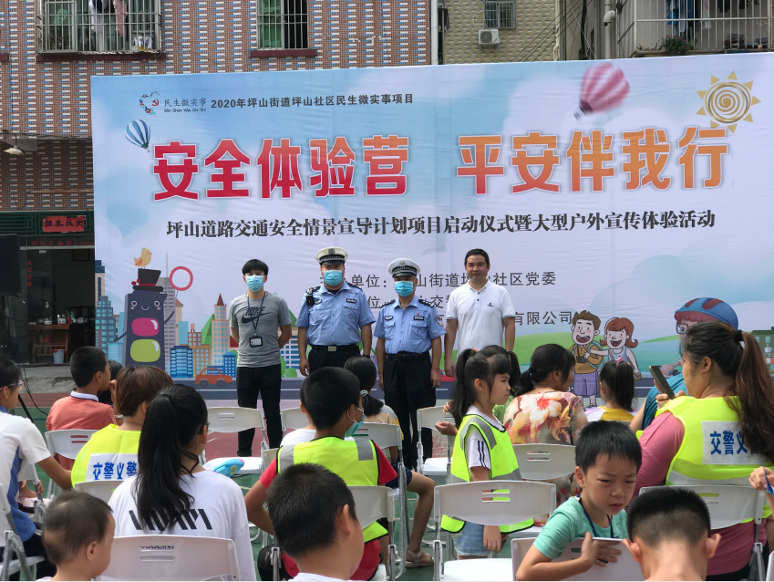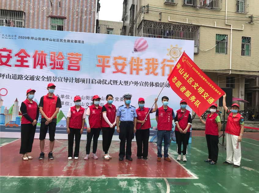 緊接着,為進一步規範文明交通志願服務隊伍,坪山社區組織了一支文明交通志願服務隊伍。坪山交警大隊對坪山社區新成立的交通文明志願者進行授旗儀式,並現場宣誓。通過以上一系列體驗式、參與式的活動,增強了社區居民對交通安全知識學習的興趣及積極性,從而讓社區居民能夠在活動過程中,更加深刻地認識到安全意識的重要性。
