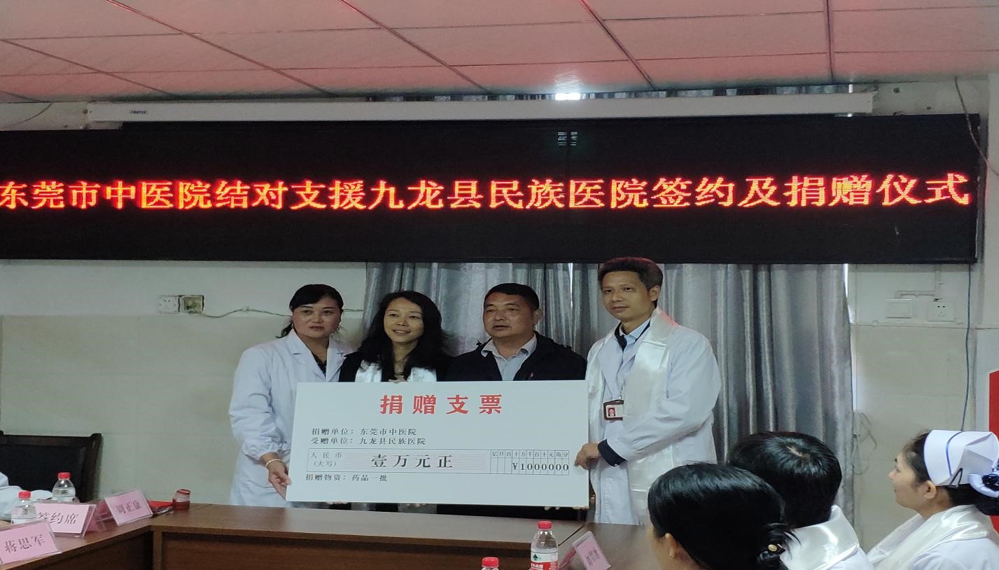 為繼續幫扶九龍縣民族醫院的衛生醫療服務水平,帶動九龍縣衛生醫療水平全面提升,東莞市中醫院與九龍縣民族醫院雙方就醫院文化建設、深化醫療改革、技術提升、人才培訓交流等繼續簽定結對幫扶協議,同時東莞市中醫院為九龍縣民族醫院實施遠程會診服務,以及捐贈藥品一批價值為14045元(含義診免費派發藥品)的醫療用品。
