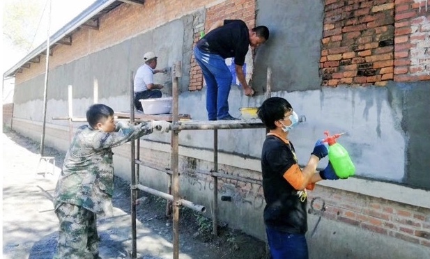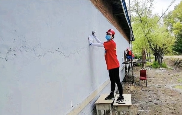 妙筆生花,說起來容易,做起來難。面對廢舊的磚牆,工作隊忙前忙後,抹水泥,搬磚塊,村民心中也深受感動,紛紛加入。屯長主動幫忙抹牆,房東大哥每天早上四點多用灑水車給牆面補水做養護,從市里借來的腳手架放在大院內剛要學着組裝,就被幾個看熱鬧的村民大哥們圍住七手八腳的幫忙安好。一個月後,牆面終於平整粉刷好。工作隊請來專業的繪畫人員對牆面進行了繪製。一筆筆的描繪勾畫,從初具形態到最終成型,每天都有人來圍觀,甚至有特意來看進度的忠實「粉絲」,還有鄰村大哥特意用輪椅推着行動不便的老母親來看畫。