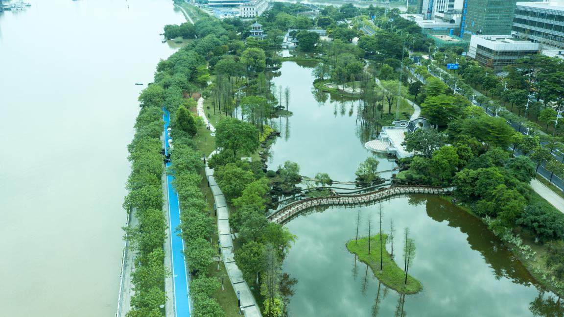 這裏構建起濱水道、緩跑道、騎行道和遊憩帶,串聯起水墨園、攬勝園、疊翠園、陳氏大宗祠、啟德威爾登酒店、高級人才公寓、官洲生命科學創新中心及8個濱水廣場。在沿線還增設了生物科普節點,提升了碧道的趣味性,豐富了遊憩體驗。