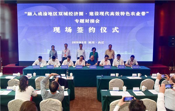 對接會上,在中醫藥方面,內江分別與重慶市中藥研究院簽署戰略合作協議,與四川省中醫藥大健康產業投資集團有限責任公司簽署「打造現代中醫藥產業示範區」協議;在農業產業方面,內江市與重慶市榮昌區簽訂《共建成渝高效特色農業帶合作協議》,與重慶市畜牧科學院簽訂《聯合組建重慶市畜牧科學院內江豬研究所合作協議》,與正邦集團有限公司簽訂《50萬頭生豬產業化項目投資協議》,與四川馳陽農業開發有限公司簽訂《隆昌市馳陽生豬標準化養殖項目投資合作框架協議》,與中國農業銀行內江分行簽訂《戰略合作協議》,與正邦集團有限公司簽訂《隆昌市正邦生豬標準化養殖項目投資合作框架協議》,與成都蓉橙九天生物科技有限公司簽訂《威遠縣無花果標準化種植示範園項目投資協議》,四川恆通動保生物科技有限公司與四川省畜牧科學研究院簽訂《「內江豬保種、本品種選育和開發利用」產學研合作協議》。