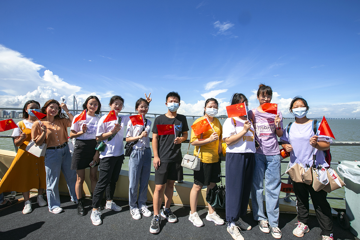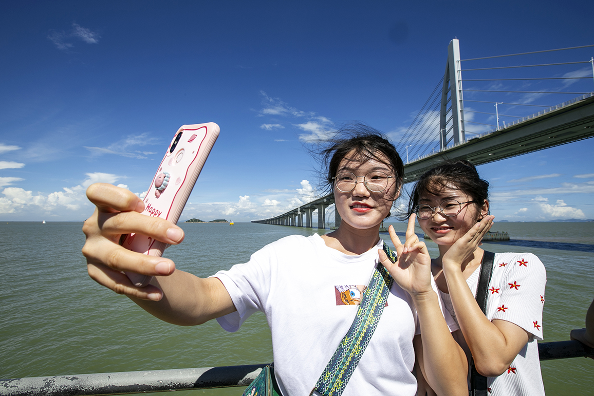 學生們開心地與港珠澳大橋留影 (陸紹龍攝)
