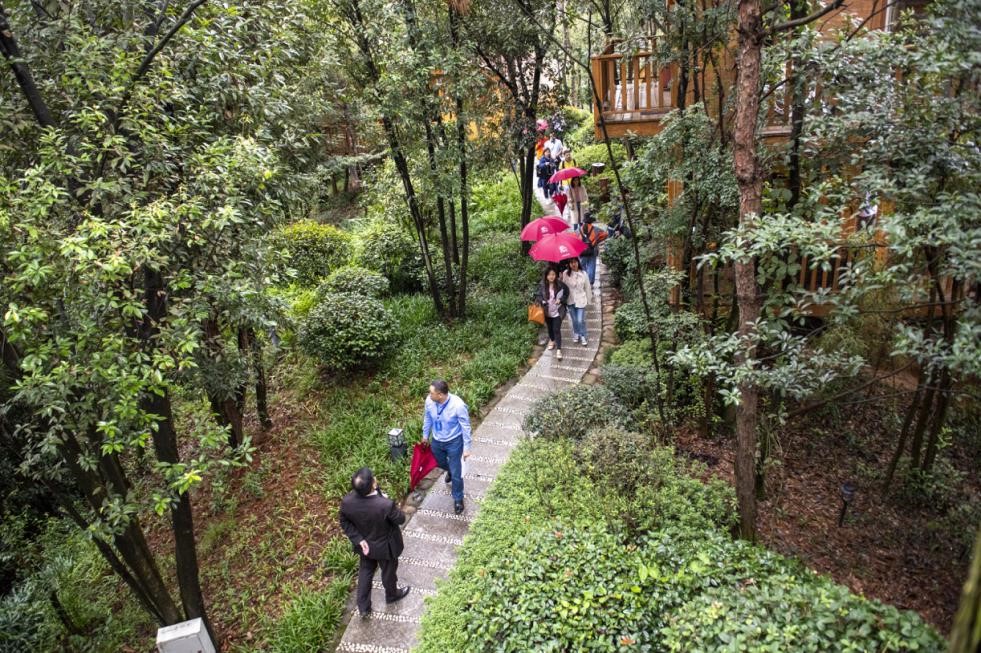 據悉,酒店一期客房總數為8間,均以獨棟別墅形式呈現。沿着青色的石階,穿梭於林間小道,只聽到草蟲唧唧,蟬兒長吟,鳥兒啁啾。推開吱呀作響的柴扉,裏面席夢思、自來水、衛生間皆齊備,像是一座袖珍的林間別墅。