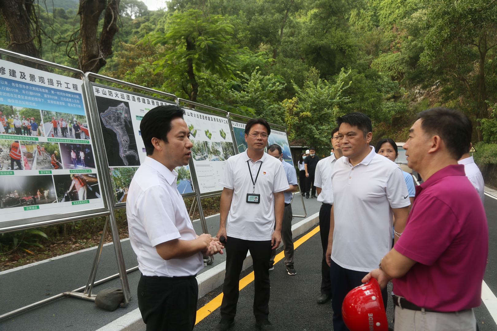 鄧飛波一行還調研了正在建設中的半山公園帶項目,沿着半山公園帶示範段步行視察,實地了解該項目工程的設計方案、景觀效果以及建設進展。記者了解到,半山公園帶是繼大梅沙海濱公園重建項目、鹽田海濱棧道重建項目後,鹽田區在山海旅遊方面啟動的又一個重大項目,主要依託現有風景區、森林公園、綠道和登山環道,採取改造和新建相結合的措施,形成一條西起盤山公路、東至大鵬,主線長40公里,總長度約69KM的半山健步道,以健步道為紐帶,連通綠道、登山道,打通小循環大循壞,實現3處瀑佈景觀、4個水庫景觀節點、6個公園(節點)、13個山海觀景平台及23個登山入口的有機串聯,打造具有鹽田特色的「生態翡翠項鍊」。鄧飛波在調研中指出,要立足山海鹽田特色,注重沿途景觀提升和人性化設置,在保證安全施工基礎上,加快施工建設進度,高品質完成項目建設任務,打造民生精品工程,為居民群眾帶來實實在在的獲得感。