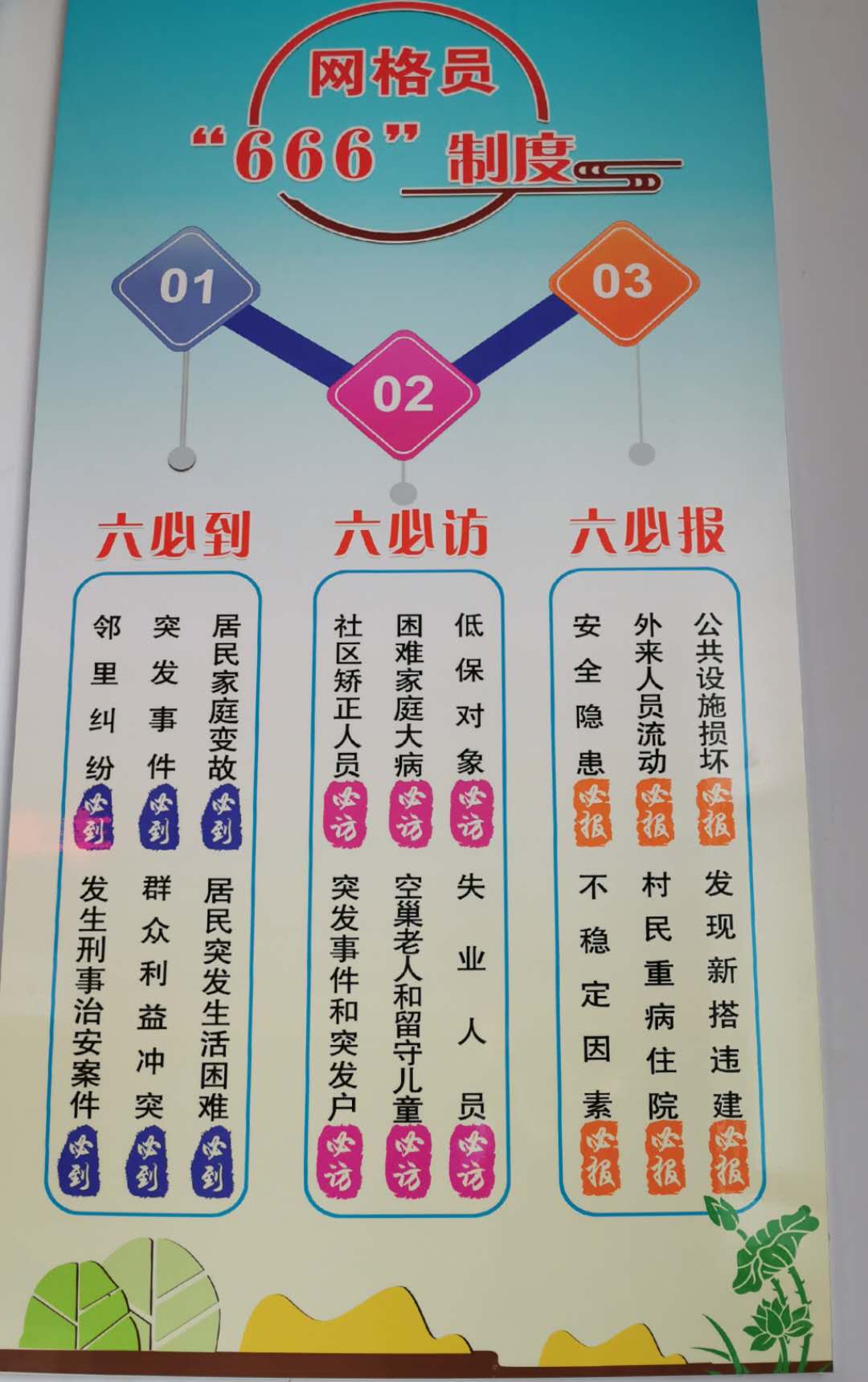 運用「1+6+N」模式,採取社會招聘、民主推薦等方式,全縣共配備專職網格員854人,專業網格員285人,兼職網格員3962人。完善了名冊台賬、處級領導包聯台賬、下沉機關幹部擔任兼職網格員台賬。建立了網格員職業標準,明確了語言溝通、事件甄別、觀察分析、協調處理、化解糾紛、服務管理「六種能力」,建立了「六必清、六必到、六必訪」和網格信息採集員、黨的政策宣講員等「十大員」工作職責。在社區、小區和村屯、街口顯著位置分區域設置網格員信息公示牌,網格員信息實現「三亮」「三清」「三公開」(註解2)。