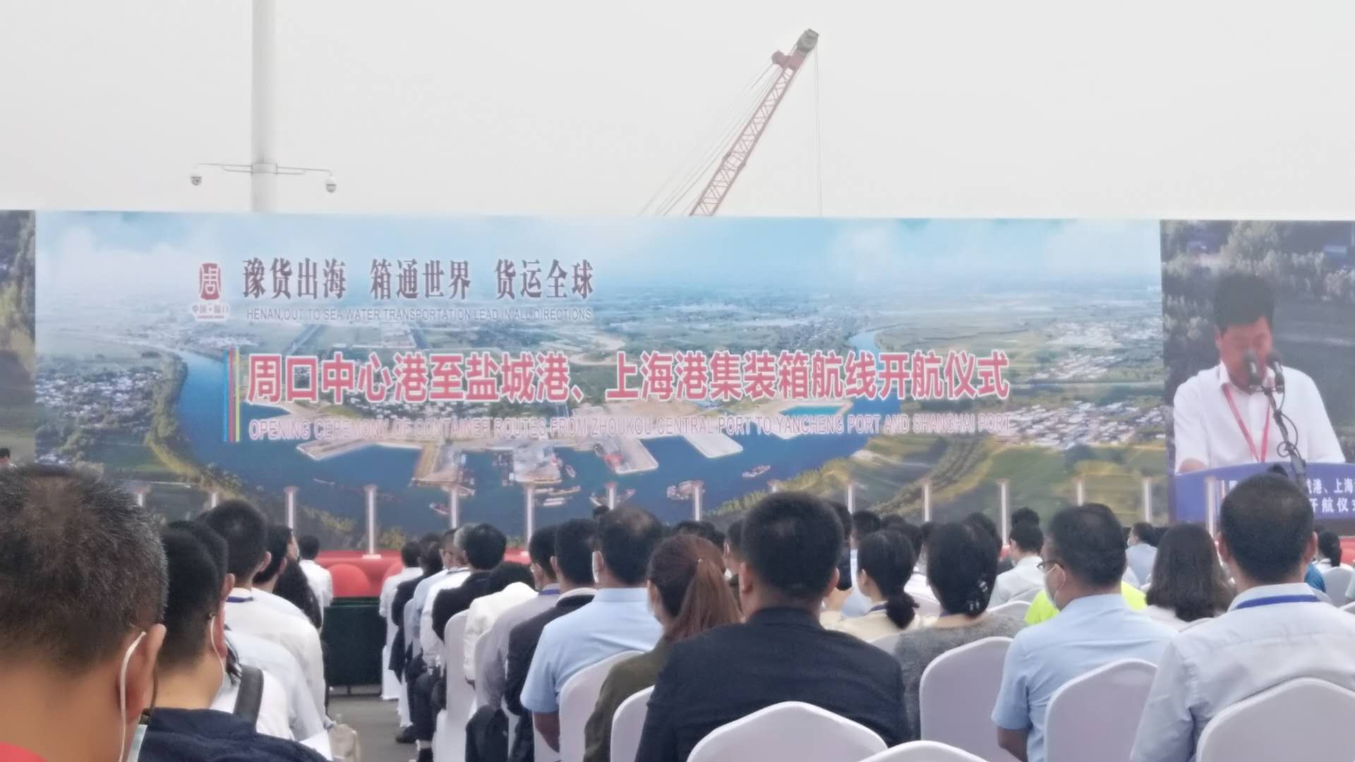 當天的開航儀式上,參會領導和嘉賓代表共同按下通航手印柱,開啟周口中心港至上海港、鹽城大豐港集裝箱運輸班輪航線。據了解,本次航行的目的地鹽城大豐港和上海港集裝箱船各兩艘,箱內裝有玉米、小麥、白糖、液袋(乳酸菌)、耐火磚。自此,周口港已開通了至連雲港港、大豐港、淮安港、太倉港、上海港5條集裝箱航線,連通了長江經濟帶、淮河生態經濟帶、環渤海經濟圈,標誌着「豫貨出海」內河航運集裝箱航線組網完成,必將為地處中原的河南全面融入「21世紀海上絲綢之路」打開更加開闊便捷的開放通道。