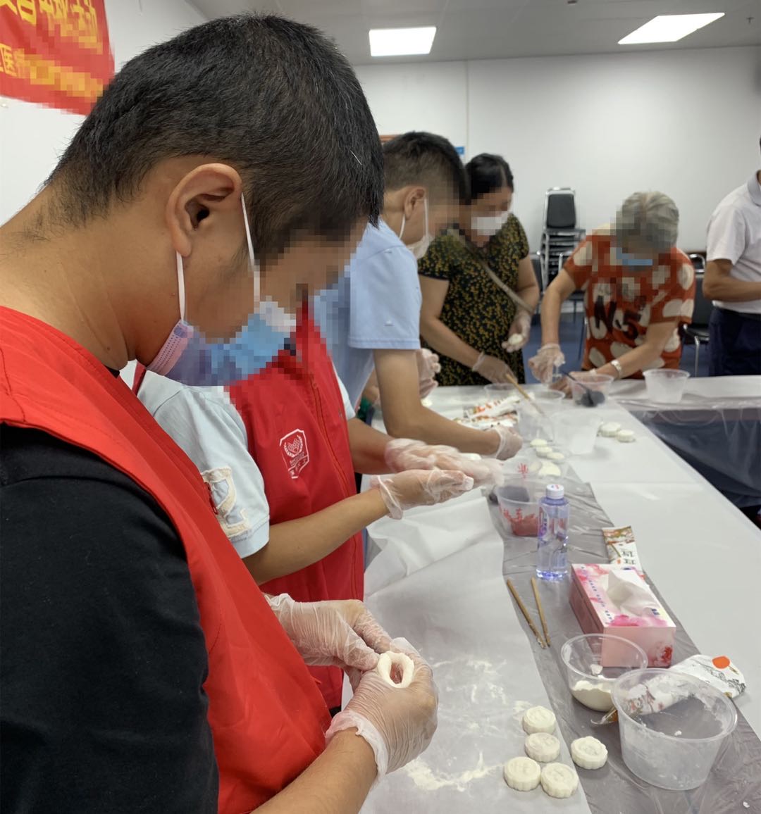 當天活動現場,大鵬新區醫療健康集團精衛社工為精神康復者及家屬講解了中秋佳節的相關知識,並示範冰皮月餅製作流程。稱皮、包月餅、壓模……精神康復者及家屬們自由組隊,進行個人衛生消毒後,逐一製作。同時,精衛社工們還與患者親切交談,詢問生活、康復情況,鼓勵叮囑他們要遵照醫囑,在精衛醫生指導下多參加各類康復活動,爭取早日康復融入社會。