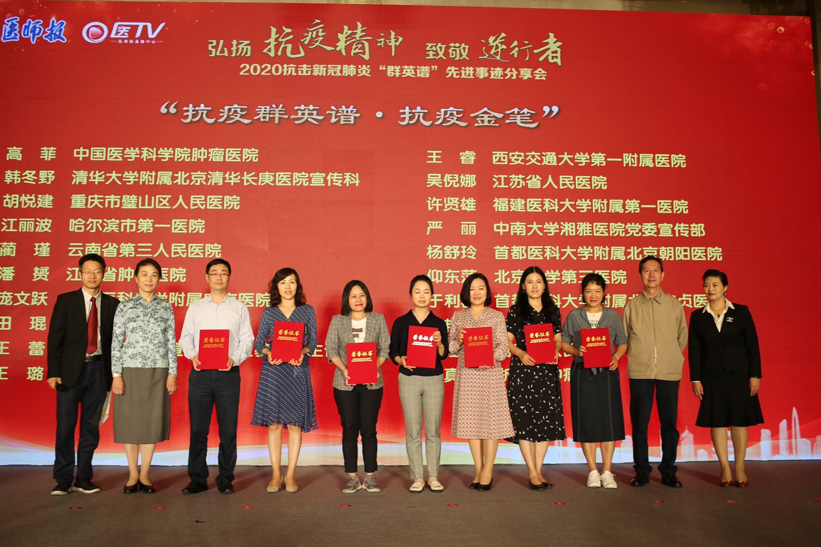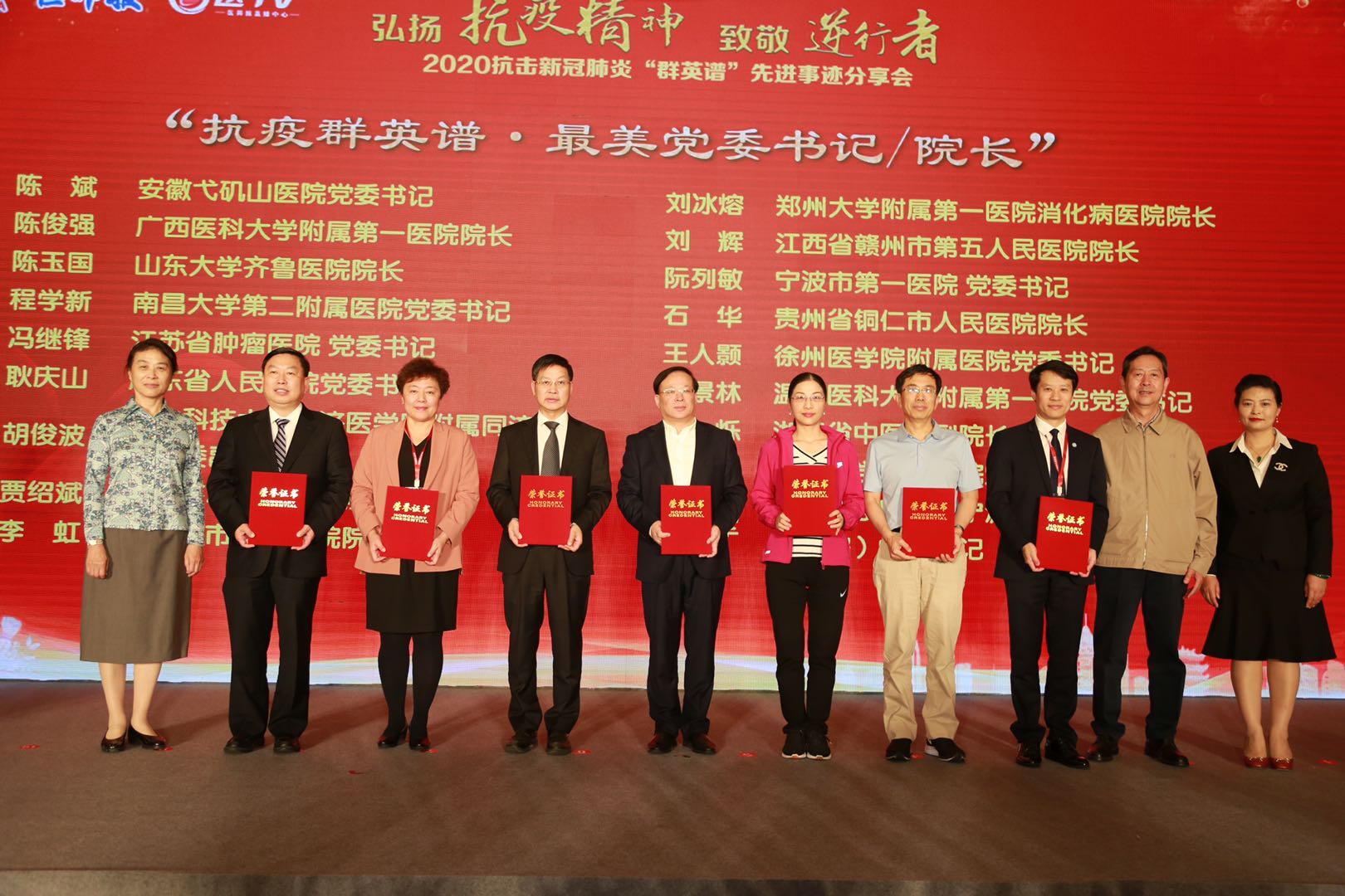 百年名院論壇結束後,由中國醫藥衛生文化協會和《醫師報》社主辦進行了弘揚抗疫精神,致敬「逆行者」——2020抗擊新冠肺炎「群英譜」先進事跡分享會活動。據介紹,此次活動為進一步挖掘和發揚「抗疫精神」,樹立典型與榜樣為目的,號召廣大醫務工作者、醫藥衛生界、全社會向先進學習而發起。自4月份開始徵集,受到整個醫學領域的積極響應和廣泛參與。活動共收到1860餘份報名材料,最終綜合各方因素評選出卓越系列、抗疫系列、最美系列三個系列的200多名優秀個人與優秀集體。