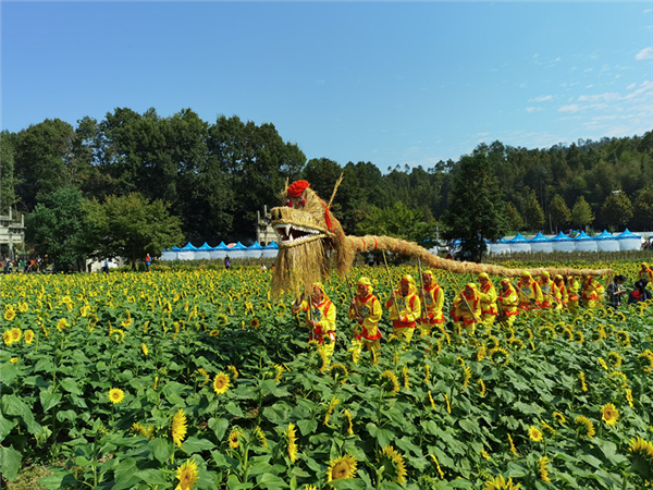 活動中,遊人穿梭葵花間,漫步於景區小路之中,微風拂過,移步換景,收穫著返璞歸真的自然神韻。同時,花田遊藝(熊出沒)、梵高的向日葵、後備箱市集、葵花射手、九宮格打卡等節目環節登場,給遊客帶來了一場豐富的旅遊大餐,而具有近千年曆史的傳統民俗活動-舞草龍更是將節日氛圍推向了高潮,草龍在村民的簇擁下舞動在花海之間,時而騰空疾飛,時而逶迤蛇行,在陽光的映襯下,龍身千姿百態、熠熠生輝,吸引了大量遊客前來合影拍照。