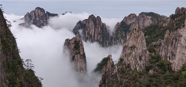 放眼望去,五百里黃山,雲海奔騰,潔白流雲與巍峨的山體相互交織著,好似一幅壯麗的山川畫卷。雲海隨著山勢從穀底慢慢升起,飄逸靈動,一時間,山峰、溝壑淹沒在雲海裏,波瀾壯闊,一望無邊,很多峰頂成了浩瀚雲海中的孤島,群峰在雲霧的籠罩下若即若離,使黃山沉浸在虛幻的意境之中,遊人宛若置身仙境。磅礴的雲海景觀受到了登山遊客的熱烈歡迎,紛紛表示黃山太美了,真的不虛此行。