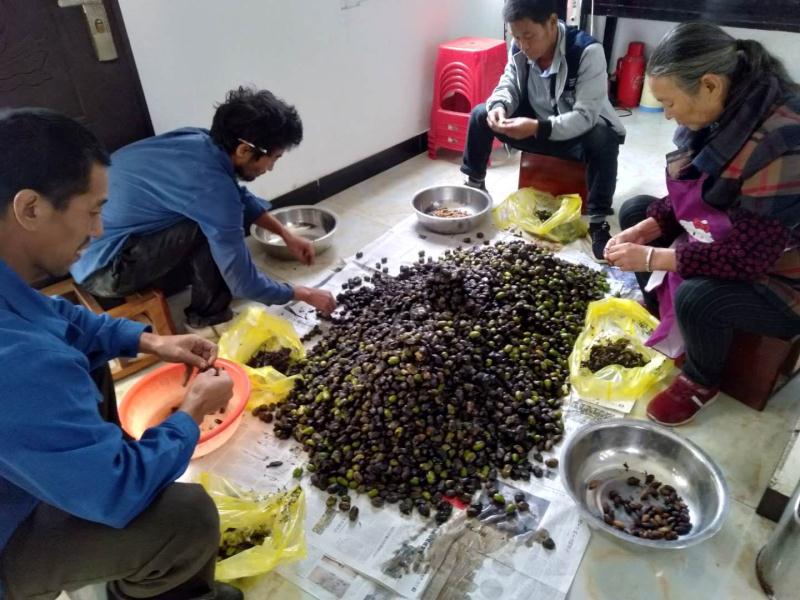 【香港商報網訊】10月9日,安徽黄山市休寧縣璜尖鄉徐家村村委會內一片忙碌,今年村集體香榧林喜獲豐收,目前香榧鮮果已完成採摘,村裏正組織村民去除鮮果果皮,大家忙得不亦樂乎。