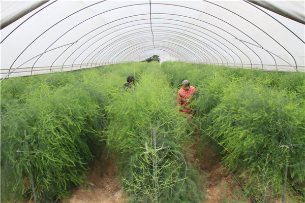走進齊心村蘆筍種植基地,放眼望去,一排排整齊劃一的塑料大棚在陽光的照射下分外搶眼。大棚里破土而出的蘆筍脆綠鮮嫩,工人們正在施肥、護苗,一派繁忙景象。品種改良後的蘆筍,季節適應性強,除了冬季不適宜播種外春、夏、秋三季都可以播種,一畝產量可達5000斤,每畝市場銷售額至少達2萬元,年產值可以達到2000萬元以上,收益很可觀。「我們的蘆筍種植基地是公司化經營的農村合作社模式,以大園區小業主承包種植的形式,由公司負責提供技術支持和回收銷售,加工後的蘆筍除了在本地銷售,主要還銷往北京、廣州及東南亞地區。這樣不但免去了承包戶的風險,為他們帶來了實實在在的收益,更利於蘆筍種植的精細化管理。」,基地相關負責人介紹到。蘆筍基地的發展壯大,同時解決了留守人員和貧困戶的就業問題。每到採摘季節,本村和附近村的婦女便會來蘆筍基地幹活,忙的時候用工人數達到300-500人,平時用工也在200-300人,這些工人大多是50到70歲之間的留守婦女。「自基地開始建大棚起就來幹活了,今年已經是第8年,每天80元,月工資有2000元左右,既有收入保障,又能照顧家庭。」村民梁文珍樂呵呵地說,今年56歲的她是蘆筍基地的一名「老員工」,她說,這個歲數還能在家門口賺錢,這在以前是不敢想的。