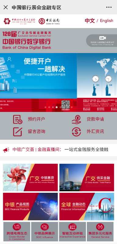 中國銀行線上金融服務專區不斷豐富跨境場景金融服務內涵,打造廣交供採金融、廣交中銀惠貸、中銀產品視圖、跨境電商生態、全球金融動態、中銀品牌展示、智能互動體驗、集團多元化服務八大板塊,為線上廣交會提供專屬數字金融服務。