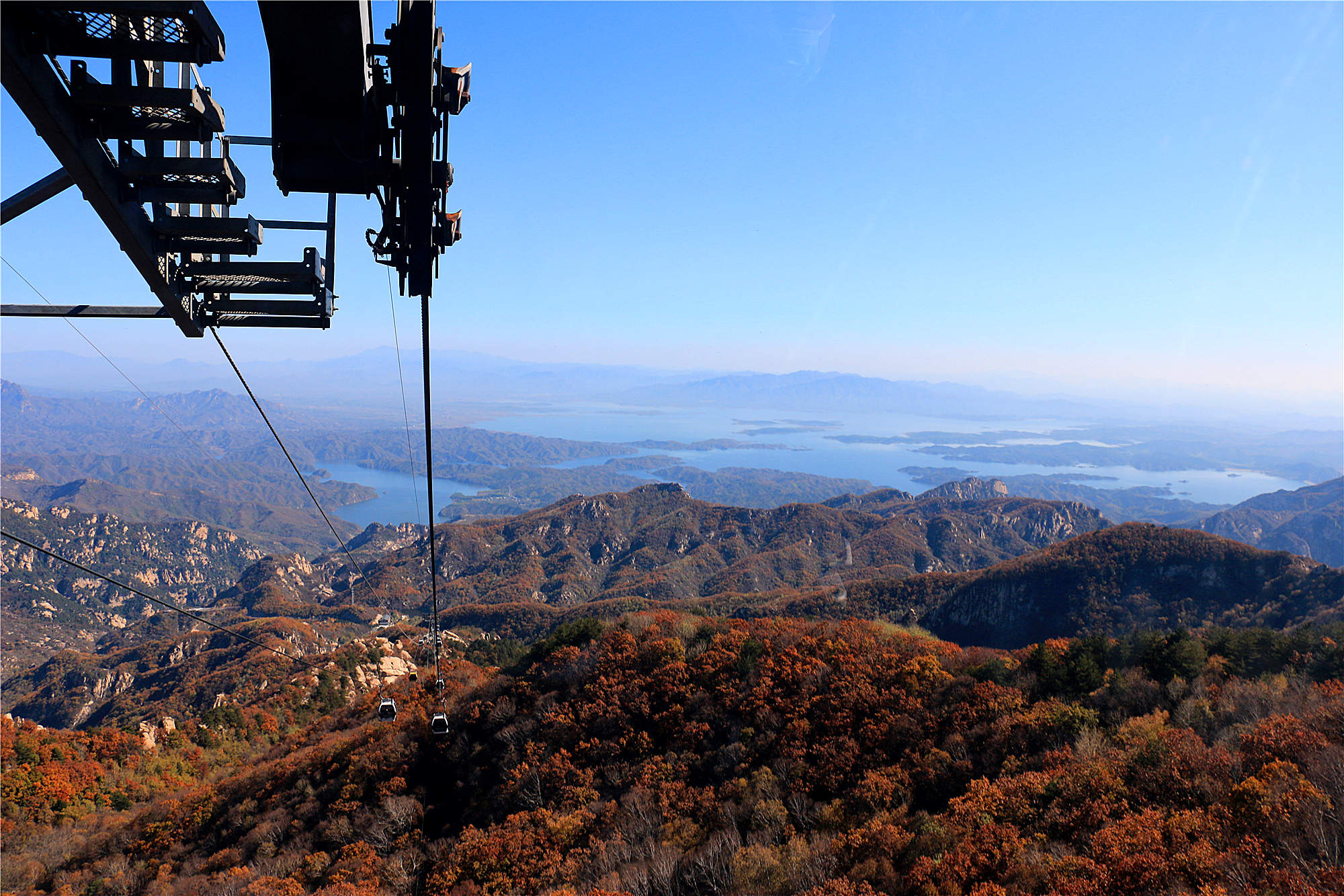 乘纜車扶搖直上1414米的雲蒙山,腳下溝壑幽深,紅葉滿山,遠處密雲水庫,群山環繞,金秋密雲美景一覽無餘