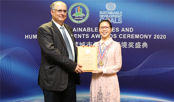 在2020可持續城市與人居環境獎頒獎盛典(SCAHSA·颯颯獎)上,聯合國前助理秘書長、國際海洋學院榮譽院長阿瓦尼·貝楠博士宣佈森林城市獲得「濱海生態環境保護範例獎」。