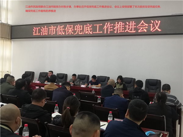 脫貧攻堅以來,江油民政局制發《江油市社會救助兜底保障專項治理實施方案》、《關於進一步做好監測戶、邊緣戶等困難群眾兜底保障工作的通知》,圍繞應保盡保,重點對困難群眾納入低保保障情況進行全覆蓋排查;組織開展「兩不愁三保障」大排查問題整改專項核查,全面完成21個鄉鎮59戶(死亡2戶2人)收入不達標的貧困戶梳理核實任務;截止目前,召開社會救助兜底保障脫貧攻堅專題會議4次、困難群眾基本生活保障工作聯席會議各1次,開展掛牌督戰30餘次。