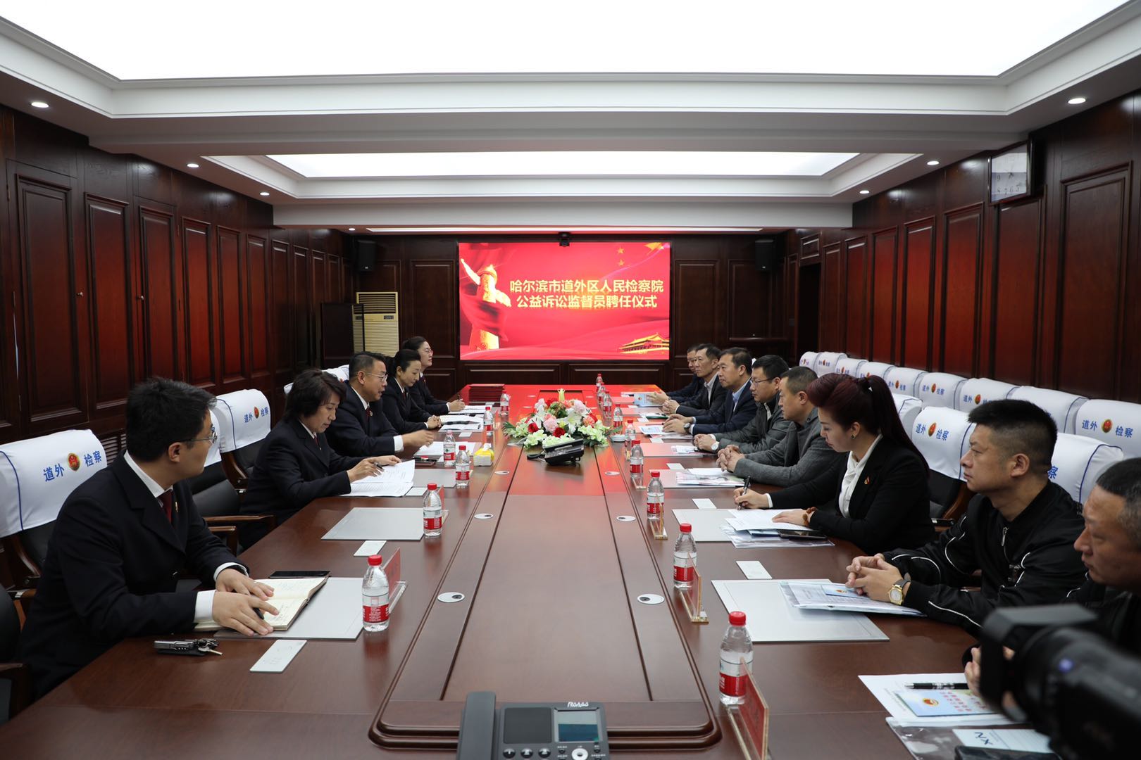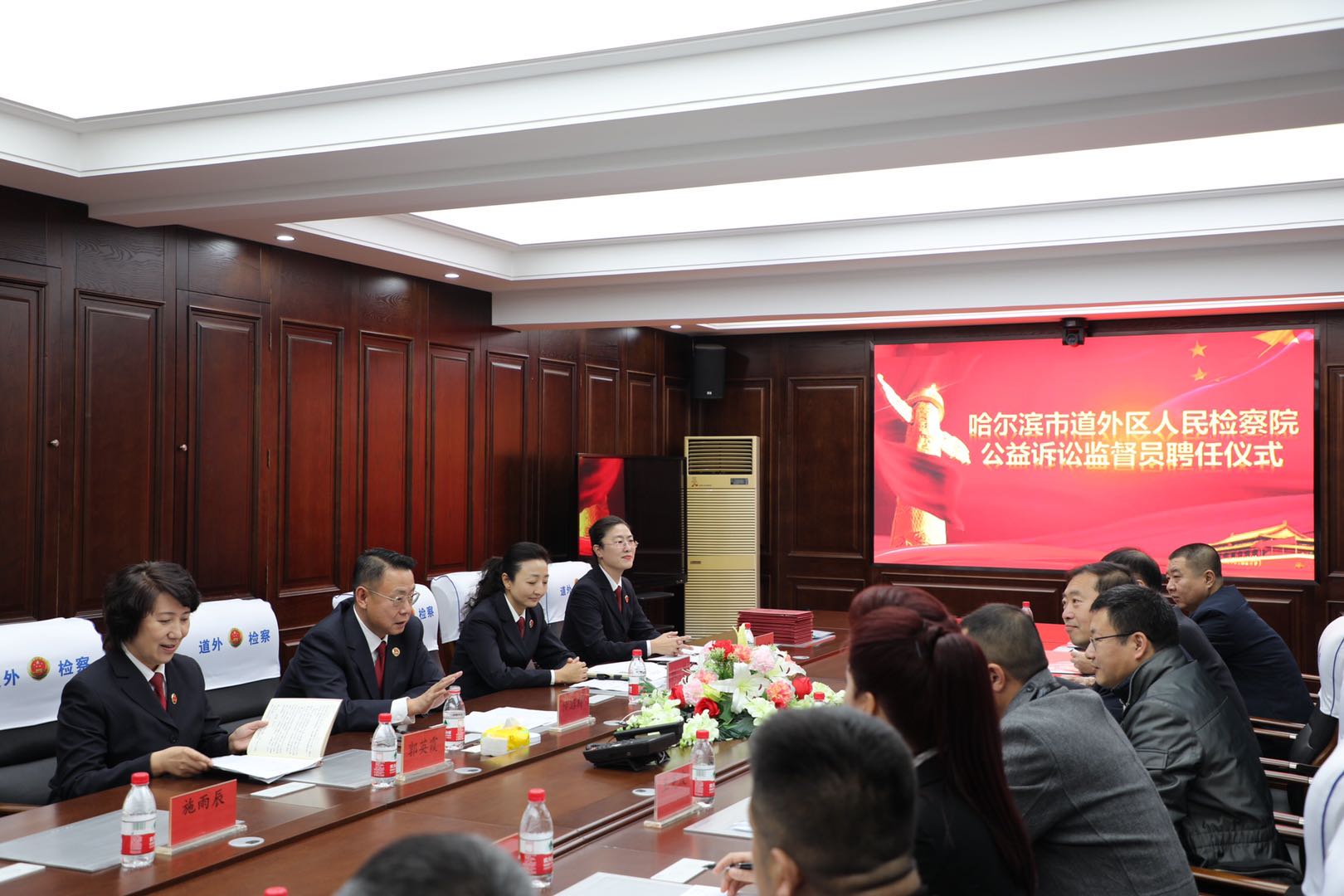 劉慧副檢察長首先代表院黨組對受聘大人代表心繫人民群眾、支持檢察工作表示誠摯感謝和敬意,並就檢察機關聘請公益訴訟監督員的目的和意義進行了簡要介紹。聘任儀式上,仲昭祥檢察長逐一為公益訴訟監督員頒發了聘書。第六檢察部主任郭英霞宣讀了《哈爾濱市道外區人民檢察院公益訴訟監督員制度》,並對道外區檢察院近三年公益訴訟工作開展情況進行了詳細匯報,使受聘公益訴訟監督員對其具體職責、工作流程有了更加深刻的認識,對檢察公益訴訟工作的職能、範圍、意義有了更加深入的了解。