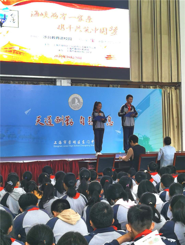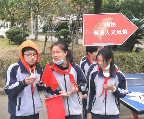 「一衣帶水隔海望 水乳交融同根情」。在新中國成立71周年、《告台灣同胞書發表》41周年之際,10月26日,由上海市崇明區人民政府台灣事務辦、上海市崇明區教育局聯合主辦,由上海市崇明區東門中學承辦的「海峽兩岸一家親 攜手共築中國夢」——「涉台教育進校園」少先隊尋「寶」爭章活動正式啟動,活動旨在讓青少年及時了解兩岸關係發展,掌握對台方針政策,了解涉台知識,在校園內營造心繫兩岸關係和平發展、實現祖國統一大業和支持參與對台工作的良好氛圍。