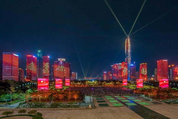 福田中心區燈光秀表演,43棟樓宇燈光聯動,點亮流光溢彩的璀璨夜景。