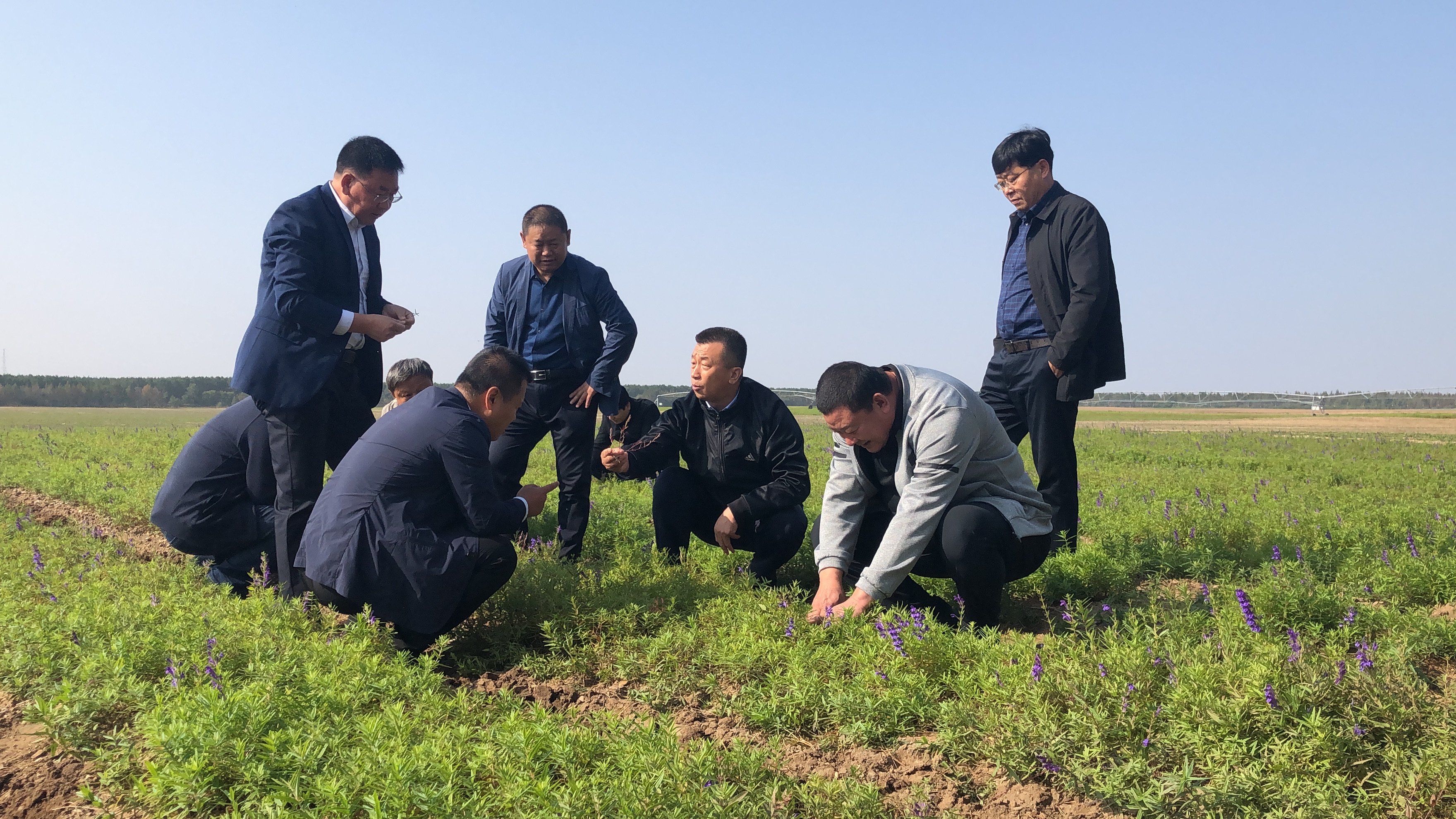 甘南縣委副書記、縣長苑正紅(右三)一行在基地查看中藥材長勢。