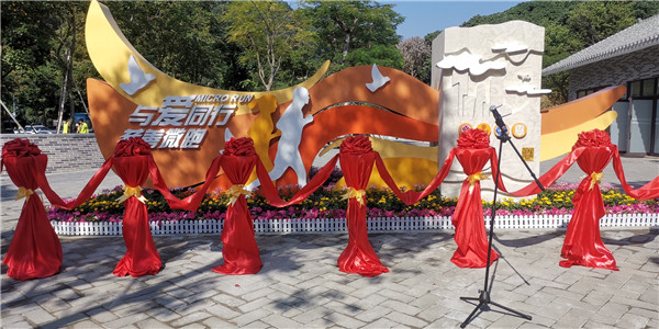 10月27日上午,「與愛同行」慈善微跑地標在深圳市寶安區航城街道教育城學子路公園管理處廣場上落成,標誌着深圳市首個慈善地標誕生。深圳市慈善聯合會、區慈善會、區民政局、區工商聯、團區委、航城街道等有關部門負責人及中行寶安支行負責人、愛心企業家、各街道商會代表、義工一同見證。