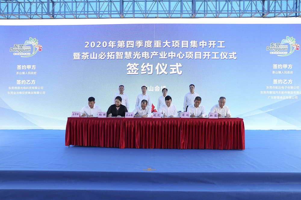 在茶山分會場,共有包括航達高新產業中心、翔國光電二期廠房建設、箭冠汽配連鎖全國運營總部、金沛鋒智能環保包裝、新盟食品總部經濟項目等5個項目現場簽約。